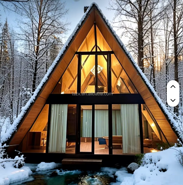 A Frame Home, prefabricated Wooden and Steel (hybrid), Insulated, waterproof, fireproof, windproof construction, Includes with kitchen & bathroom equipments, in 15×30 feet, Steep A-Frame Roof, 60°+ roof pitch naturally sheds heavy snow, Prevents snow accumulation load stress, Reduces risk of roof collapse, Minimizes ice dam formation, Extremely suitable for Ontario winters, Lower long-term structural risk.